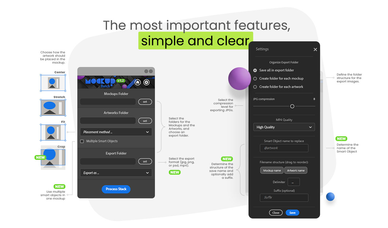 Combine mockup name, artwork name, and suffix in any order — and separate them with your preferred delimiter (_, -, ., etc.).